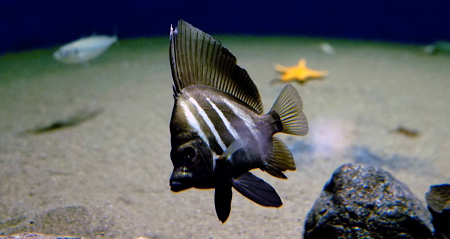 無事に展示デビューできたカワビシャは、今では水槽にも慣れ、大きなひれを広げてゆっくり泳いでいます。帆のように大きな特徴的な背びれを開いた姿はとても迫力があります。