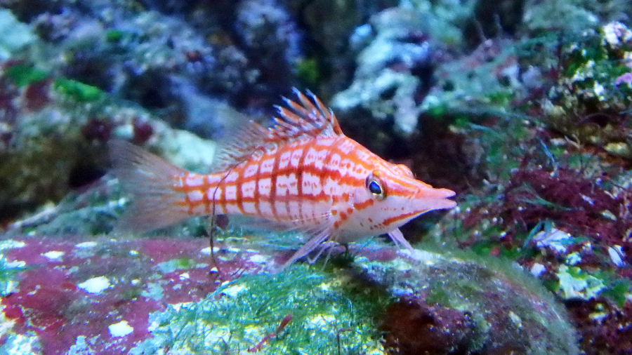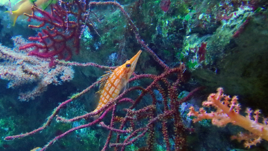 ゴンベのなかまはサンゴや岩場の上にとまって大きな目をキョロキョロと動かし、獲物を探しながら周囲を警戒する姿が、タカ(=ホーク)に似ていることから、英語で「ホークフィッシュ」と呼ばれています。ヤギやウミトサカのなかまをすみかとするクダゴンベもゴンベのなかまで、大きな胸びれを広げてヤギの枝にとまり、ときおり大きな目をキョロキョロと動かしている姿が見られます。