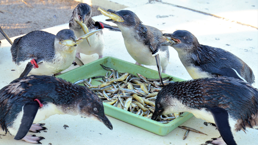 しかし、フェアリーペンギンのえさには粉末状のビタミン剤を混ぜてあるので、薬剤が水で洗い流されてしまわないよう、陸上で与えているのです。ただし、フェアリーペンギンもこの食べ方がすぐできるようになるわけではなく、「学習」する必要があります。