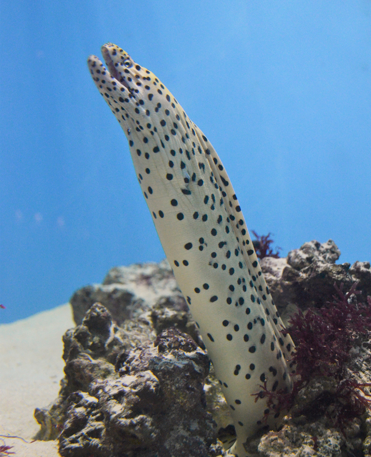 ニセゴイシウツボは成長すると全長2m以上にもなる大型のウツボです。体の模様が黒い碁石を散りばめたような斑点模様に似ていることから、この名がつけられたと言われています。この斑点模様は成長するとともに小さくなります。