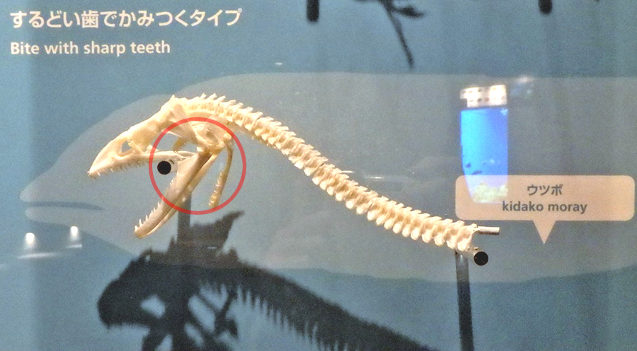 この写真がウツボの骨格標本です。赤丸がウツボの咽頭顎です。
