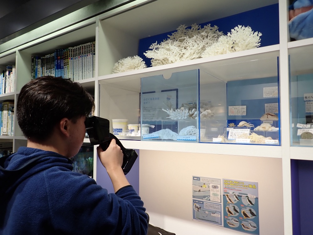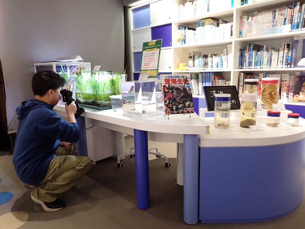 情報資料室ではサンゴやアカシュモクザメなどの骨格標本、カタマイマイやアカハライモリの水槽、資料の閲覧などをすることができます。