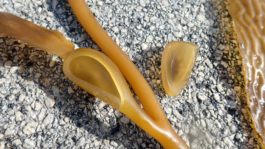 このようにジャイアントケルプは気胞の浮力で上へと持ち上げられ、仮根で岩にしっかり固定されているので、波に揺られながらも倒れることなく立っていられるのです。