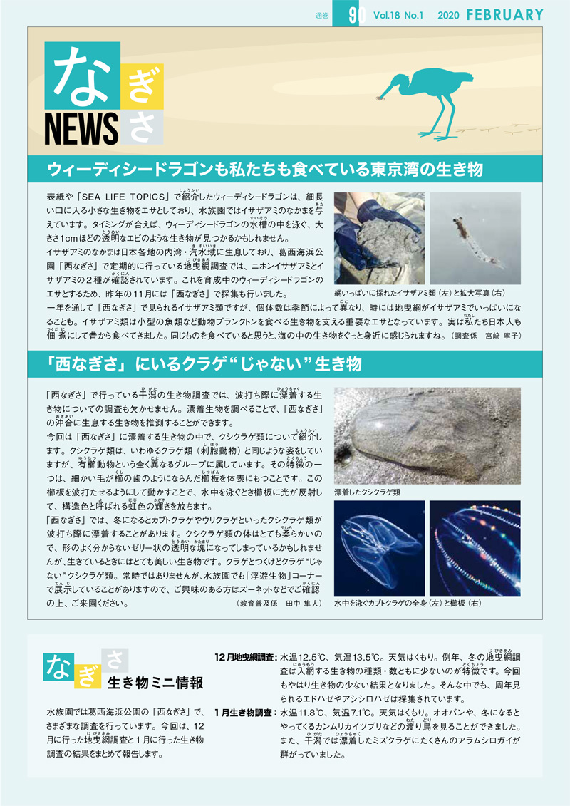 最新号の90号(2020年2月)を公開しました。水族園の生き物の重要なえさにもなる「西なぎさ」の動物プランクトンのほか、 クラゲ"じゃない"クシクラゲを紹介します。