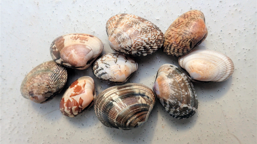 アサリは個体ごとにさまざまな殻のもようをもつ、個性的な美しい貝です。生息域は非常に広く、日本では北海道から九州にかけて各地に分布しています。おもに砂泥の干潟にすみ、筋肉質の「あし」とよばれる器官を使って砂の中にもぐります。
