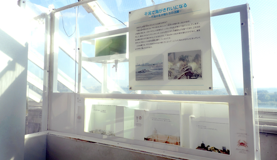葛西臨海水族園にお越しいただいたとき、みなさんは「東京の海」エリアの2階に立ち寄られているでしょうか? このエリアは水槽を上からのぞき込めるだけではなく、大きい水槽では観察しにくい小さな生き物を展示している小型水槽が並んでいます。そのうちの一つが「アサリの浄化」水槽です。