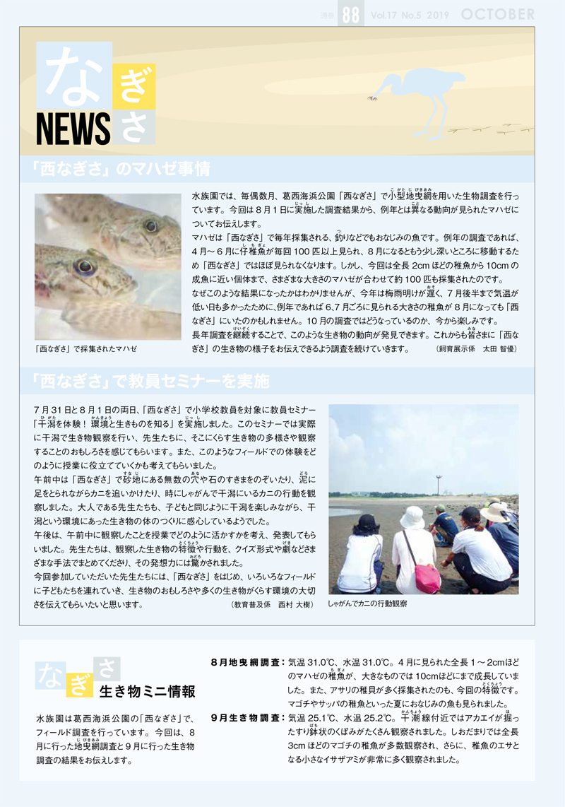 最新号の88号(2019年10月)を公開しました。8月の「西なぎさ」生物調査で採集されたマハゼについて紹介するほか、教員対象セミナー実施のようすをお知らせします。
