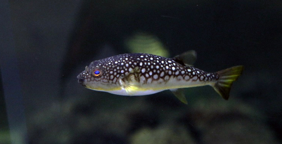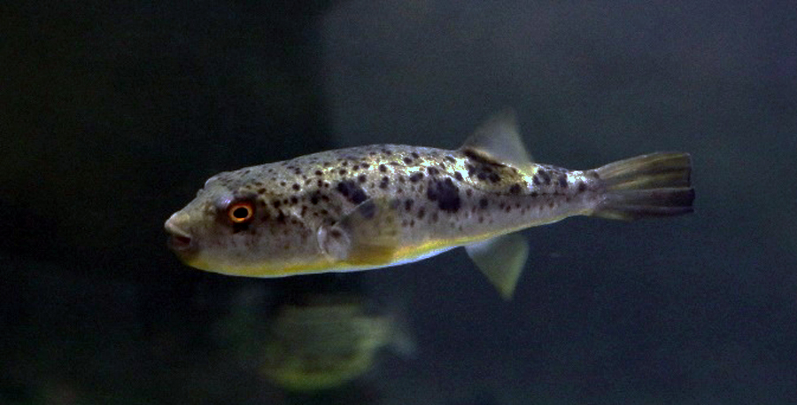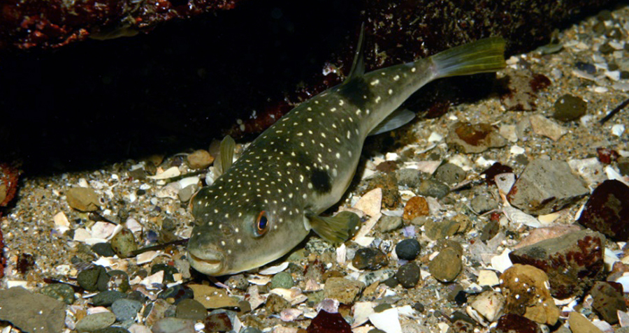 全長40センチほどになるヒガンフグは、紹介した4種の中ではもっともも大きくなる種類です。日本沿岸に広く分布していて、岩場や砂地などさまざまな場所で見られます。背中の色は茶褐色で多数の黒点に覆われており、また虹彩(瞳孔の周辺部)が赤いのも特徴です