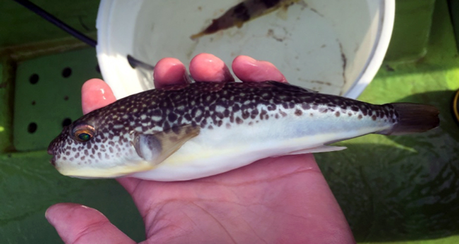 コモンフグは全長25センチほどで、クサフグより少し大きくなります。沿岸の浅い部分に多く生息し、クサフグとともに汽水でも見ることができます。背中の地の色は褐色で、背中からお腹側にかけて大きくなる白点模様に覆われています。また目から尾びれの前にかけての背中に6〜7本の薄い黒い帯があります。