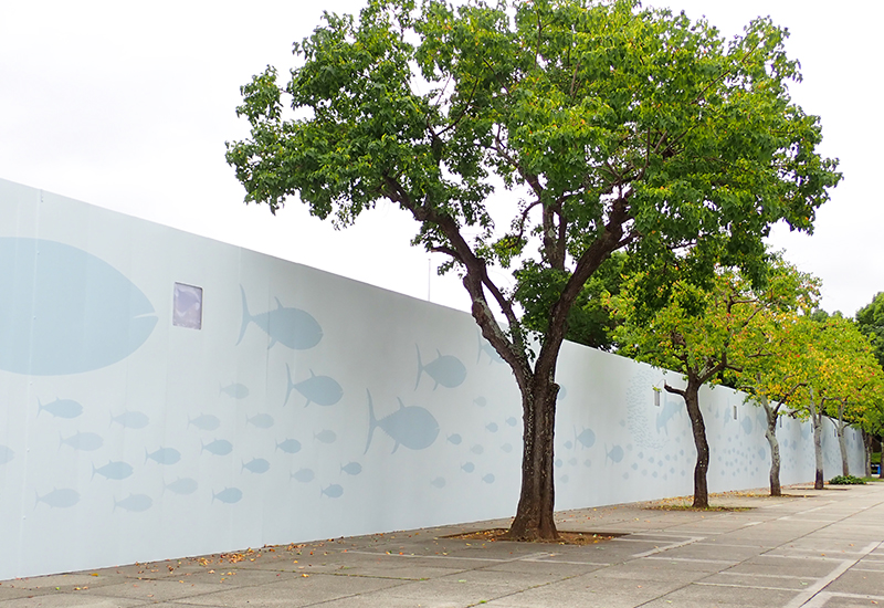 2024年7月には新水族園の工事エリアに仮囲いを設置しました(2024年6月7日お知らせ)。正門を入ってすぐの仮囲いは長さが70メートル、高さが3メートルあります。この大きなキャンバスを活用して、ご来園のみなさまに協力いただいてつくるウォールアート「夢いっぱいのおさかなアート」を制作することにしました。