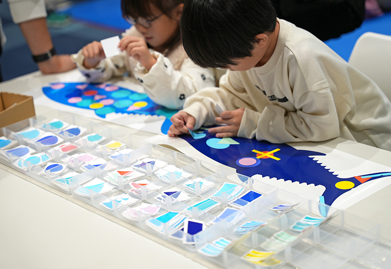 ワークショップは小さな子どもから大人の方まで、多くの方にご参加いただきました。シール選びから配置までじっくり考える方もいれば、ダイナミックに貼る方もいて、取り組み方もさまざまでした。できあがった作品も、すべての色を使ったカラフルなものや同系色でまとめたシックなものまで、バリエーション豊かに仕上がりました。「どの色にする?」「まだ貼れるかな」など話しながら、どのテーブルも終始にぎやかでした。
