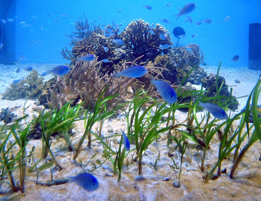 現在水槽内では数種の幼魚を展示しています。淡い青色の体色がきれいなデバスズメダイの幼魚が危険を察知するといっせいにサンゴの隙間に隠れたり、紺地に白いうずまき模様の特徴的なタテジマキンチャクダイの幼魚が海草に付着した藻や小さな生物をついばんでいたり、「ゆりかご」の環境を活用した魚たちの行動が観察できます。