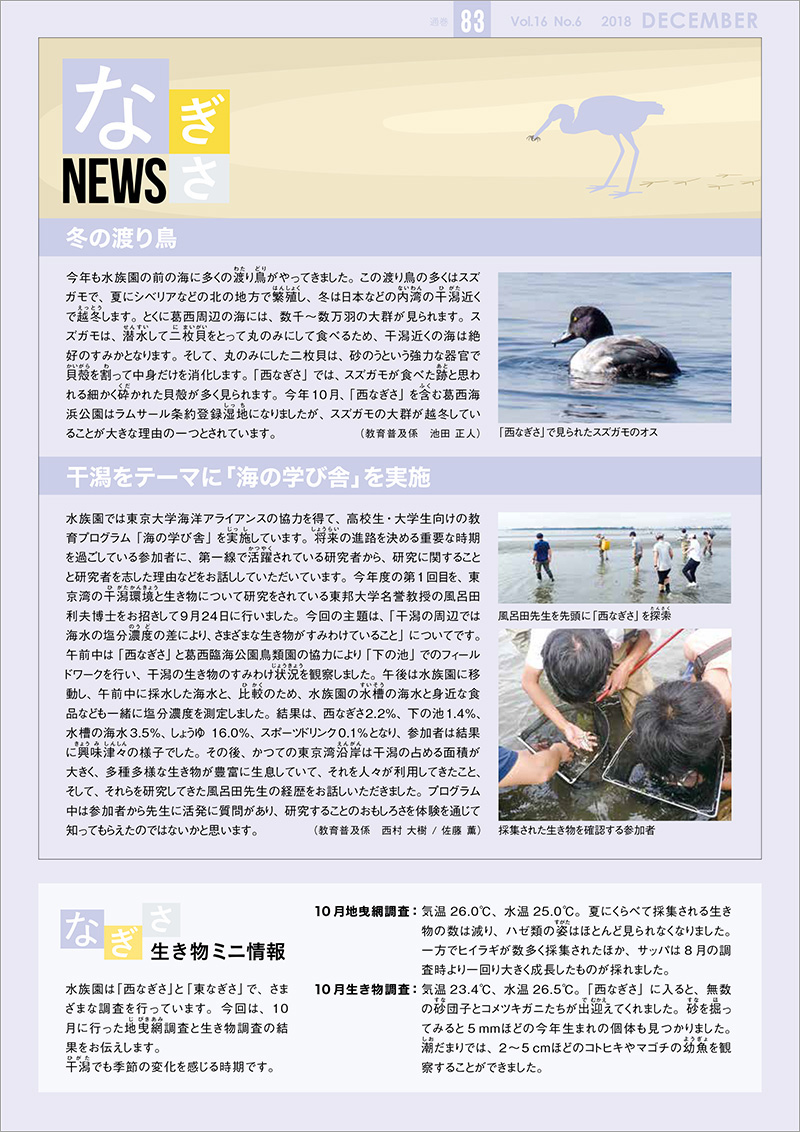 その調査結果や観察会のようすなどをお伝えするのがこの「なぎさNEWS」。水族園の機関誌「SEA LIFE NEWS」のコーナーです。