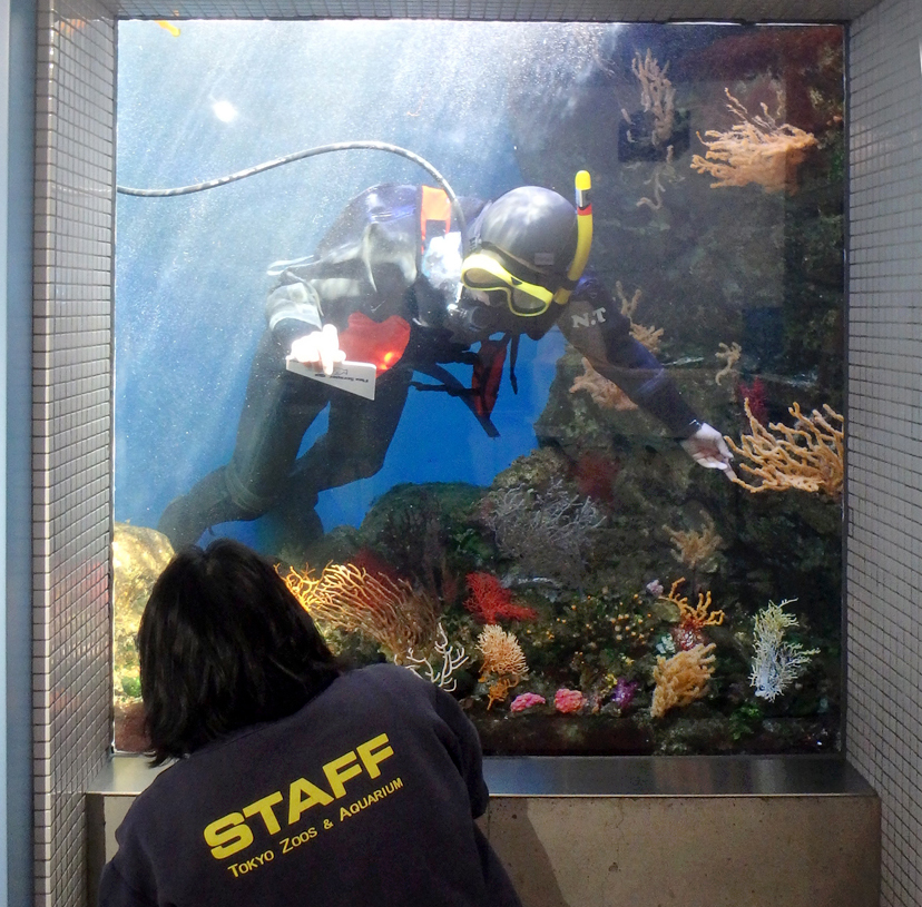 ダイバーは保温と安全のためにウェットスーツを着て、水中でも空気が吸えるスクーバ機材をつけて水槽に入ります。そして、ダイバーには必ず付き添い係がついています。付き添い係のもっとも重要な任務は、ダイバーが安全に作業できているか、常に気を配ることです。ほかにも水槽の上からダイバーに道具を渡したり、水槽の前から全体を見て仕上がりをチェックしたりしています。