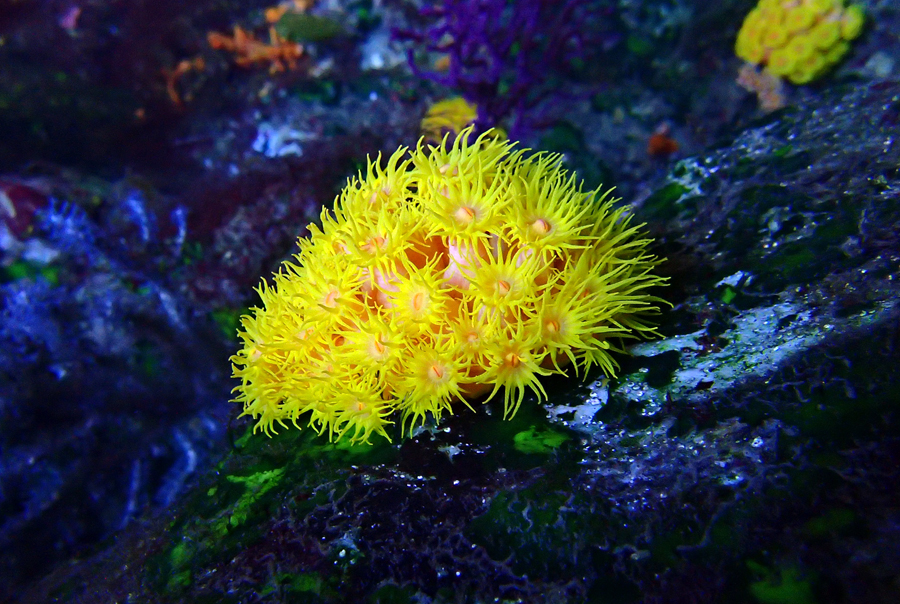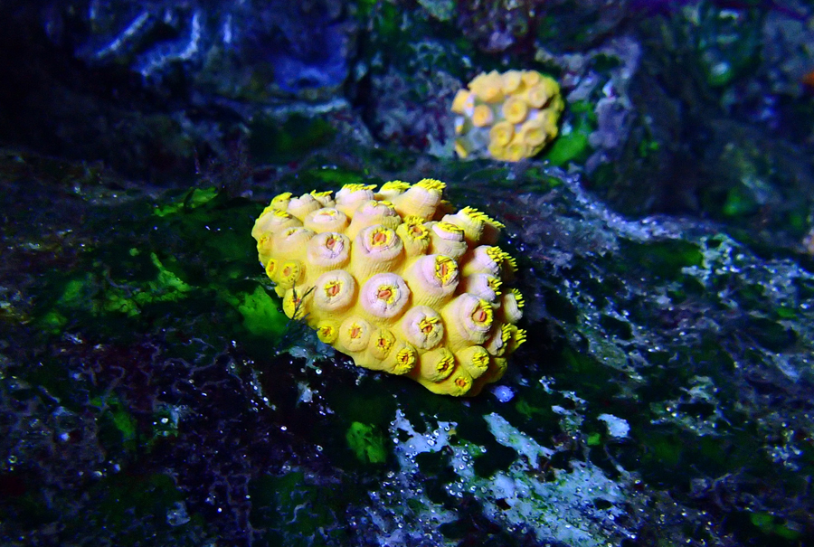 このたびイボヤギが展示に加わりました。イボヤギは数十から数百のイソギンチャクが集まったような姿で、他のサンゴのなかまに比べて大きなポリプをもっています。黄色のポリプをきれいに広げた姿はまるで岩肌に咲く花にも見えます。