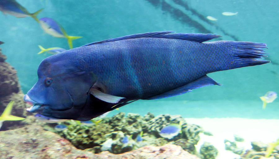 葛西臨海水族園の「東京の海」エリアにある「小笠原の海4」水槽で悠々と泳ぐ青い体の魚1尾──これがカンムリベラです。水槽内でいちばん大きな魚なので、すぐに見つけることができるでしょう。