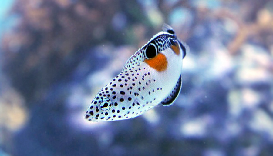 幼魚のときはさぞかし愛嬌があるのだろうと考えるところですが、成魚とはまるで別の魚に見えるほど、色もかたちも異なります。幼魚は「東京の海」エリアの特設展示会場で、2018年11月1日から開催している特設展「海のゆりかご」で見られます。水槽の中をひらひらと泳ぐ全長が10センチくらいの個体ですが、青くて頭が突き出ている…のはあくまで成魚の特徴。白い体に朱色の斑紋、頭部にゴマ模様のあるのがカンムリベラの幼魚です。