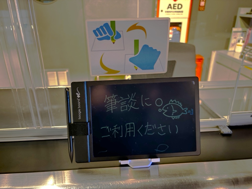 日本を訪れる旅行者の増加に伴い、水族園にも海外から多くのお客様が来園します。そのため、案内図は多言語対応(英語、韓国語、中国簡体字、中国繁体字)で用意し、案内誘導サインは日英二言語併記を基本に設置、館内自動放送は日英の二言語で対応しています。通訳を必要とするお客様のため、入園券の券売窓口や案内カウンターでは、来園者とオペレーター、スタッフの三者間でのコミュニケーションを可能とするタブレット端末による映像通訳がおこなえるように準備しています。また、体が不自由な方にも安心してご利用いただけるよう、聴覚に障害をお持ちの方のため筆談ボードを設置するほか、手話でもコミュニケーションがとれるように、タブレット端末による映像通訳を用意しています。