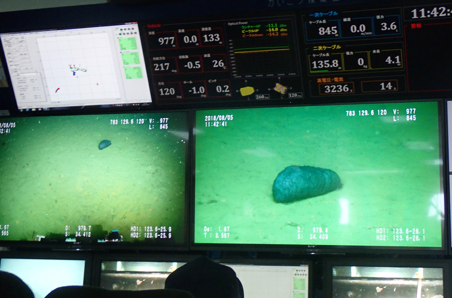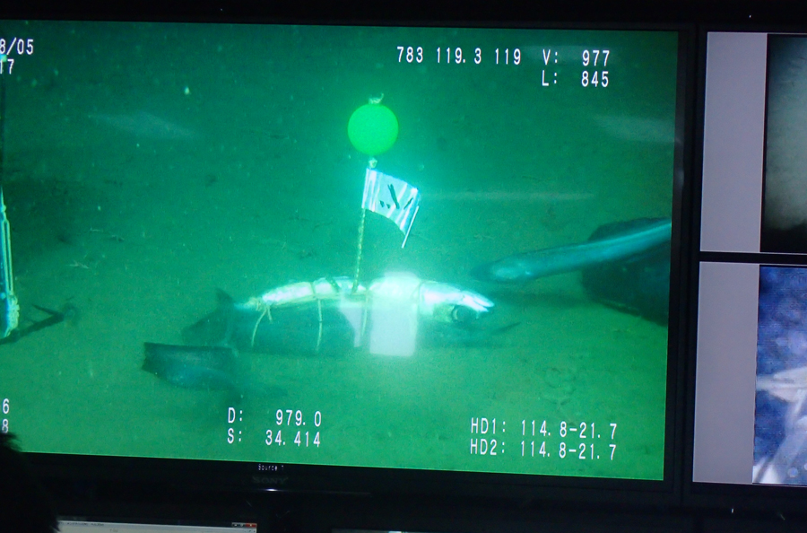 「かいこう」はおよそ75分で水深約1,000mの深海にたどりつきました。泥ばかりの海底で最初に出迎えてくれたのは、ワタゾコナマコのなかまでした。その後大きなサバをベイト(=餌)として海底に設置すると、においを嗅ぎつけたソコダラのなかまやホラアナゴのなかま、コンゴウアナゴらしき魚がやってきました。