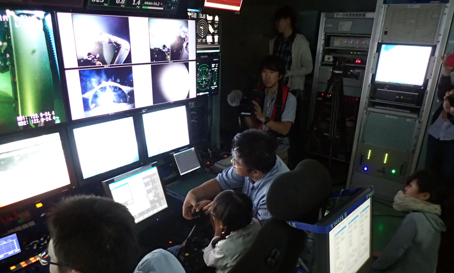 子どもたちは「かいこう」の映し出す深海のようすに目を凝らすだけでなく、水深や水温などの記録も熱心にとっていました。また、「かいこう」のマニピュレーター操縦体験も行われ、操縦の難しさを実感したようでした。