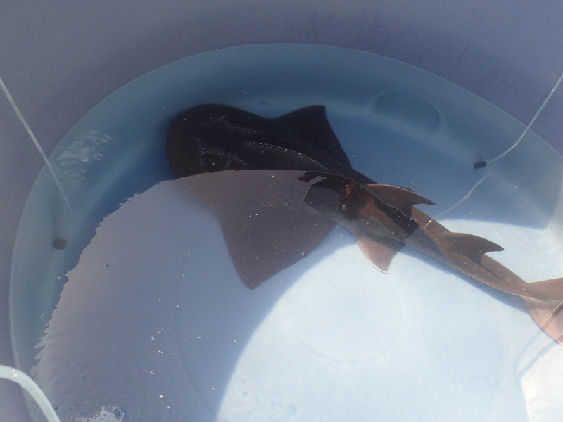 | 搬入時のシノノメサカタザメ | 水槽を泳ぐシノノメサカタザメ |