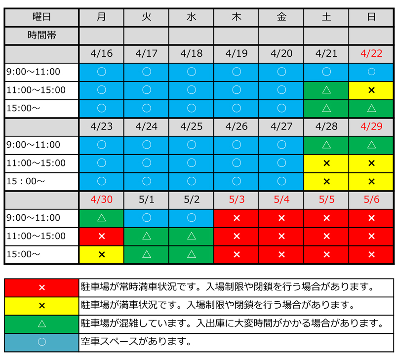 ゴールデンウィーク期間中の葛西臨海公園駐車場の混雑予測は以下のとおりです(例年実績による予測です。天候などにより状況が変わります)。なお、道路での入庫待ちはできませんのでご注意ください。