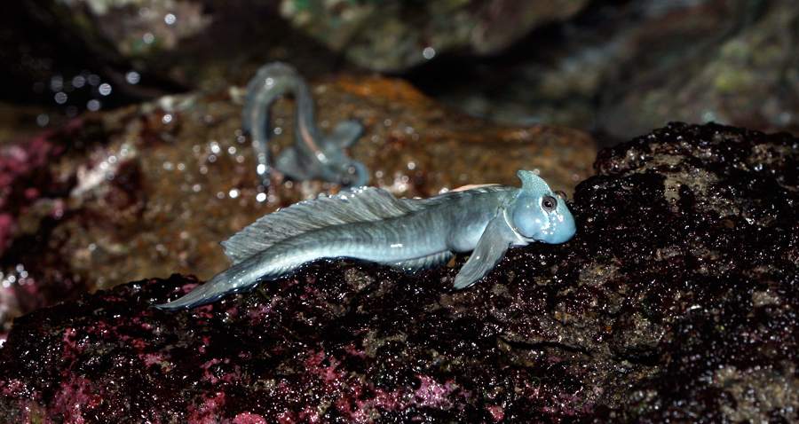 タマカエルウオは岩の上などをピョンピョンと跳ねて移動するときは、長い体を曲げてから尾びれで岩をキックしてジャンプします。また、体を支える大きな胸びれを使って岩をよじ登ることも可能です。タマカエルウオは岩についた藻などをえさとし、下向きの口を使ってこそぎ取るようにして食べるようすが見られます。
