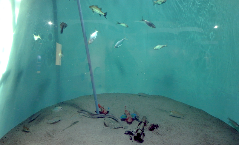 葛西臨海水族園の「東京の海」エリア「東京湾の漁業」水槽では、東京湾で漁獲されるさまざまな魚を展示しています。ここでは水槽の中層や表層を泳ぐスズキやマアジなどの魚が目に入ります。