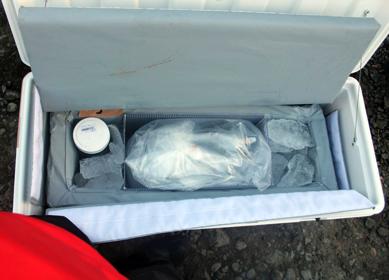 輸送用の氷は、小型船でエスクデロ基地から30分ほどの距離にある「コリンズ氷河」周辺に漂う流氷を採集して使用しました。南極では市販の保冷材は入手困難ですが、氷はまわりに豊富にあるため、この方法を取っています。
