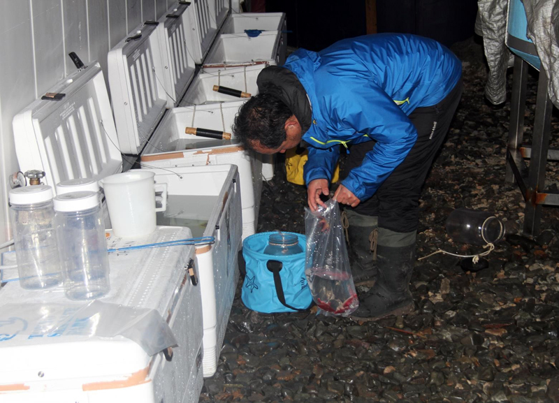キングジョージ島での2週間ほどの採集が終わり、私たち葛西臨海水族園南極調査チームは生物の輸送に取りかかります。南極の海の水温は1℃なので、生物を状態よく運ぶために、その水温を保たなければなりません。そこで使用するのが、大型のクーラーボックスの中に断熱材でできた袋を組み合わせ、保冷効果を高めた特殊な輸送箱です。この中に氷を入れて水温を保ちます。