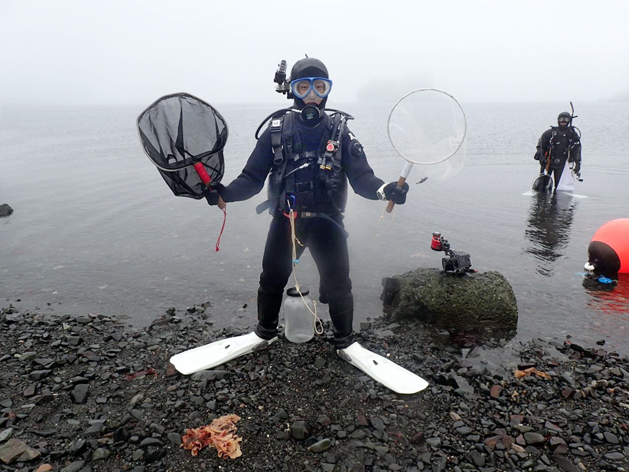キングジョージ島ではスクーバダイビングで生物採集をおこっています。ダイビングのときには「ドライスーツ」という、体が濡れないしくみの潜水服を着ています。顔と手は濡れてしまうのですが、分厚いフードとグローブをして、寒さに備えています。