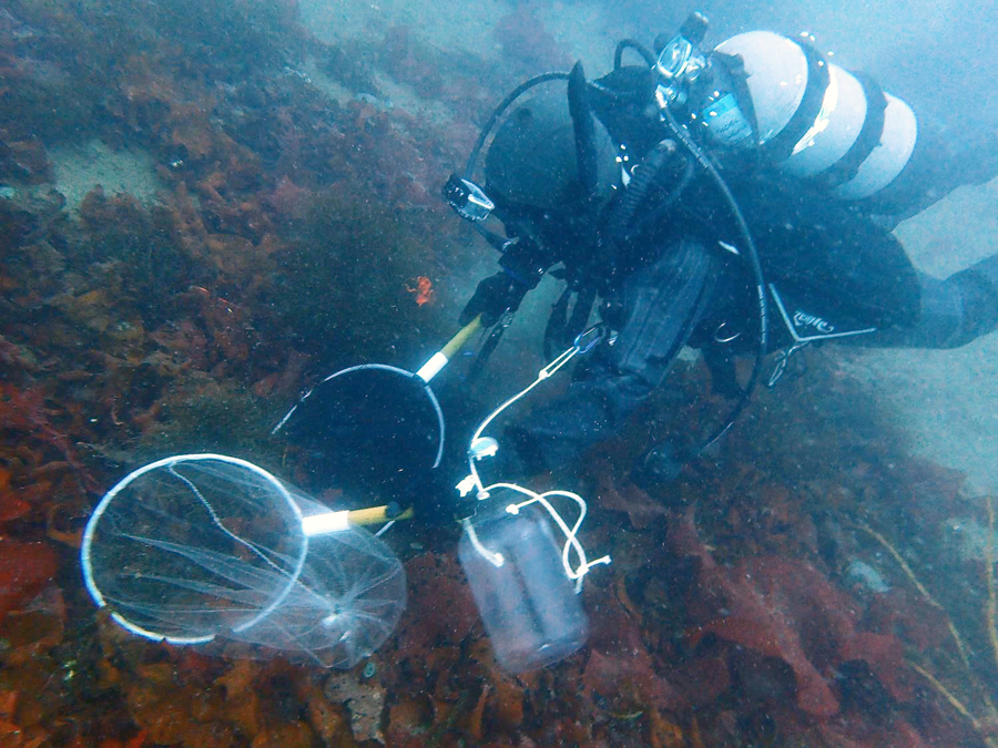 生物の採集にはおもに手網を使います。藻溜まりでは2本の手網でダスキーノトセンが隠れている藻を挟み込むようにして採り、岩場では岩の隙間にいるアンタークティックスパイニープランダーフィッシュを指で網のほうへ追いこみます。