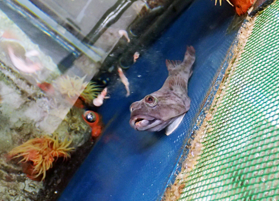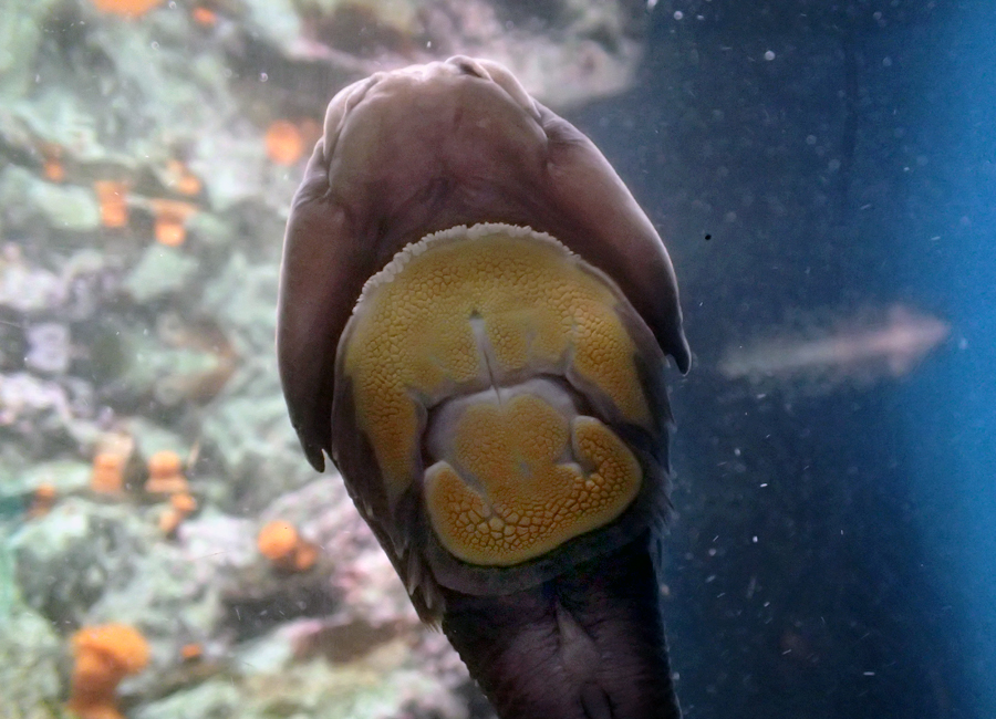 水槽裏から見たロックサッカー。 えさに狙いを定めている。青い部分が垂直面 | アクリル面に吸盤ではりついている |