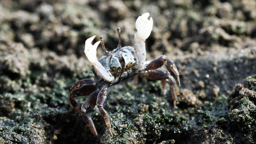 あたり一面数百尾を超えるチゴガニの大群がいっせいにウェイビングする光景は圧巻です。しかし、寒い冬は地中の巣穴で冬眠し、暖かい春が来るのを待ちます。ちなみに、このウェイビングはおもにオスがおこない、メスに対する求愛行動と考えられていますが、本当の理由はわかりません。