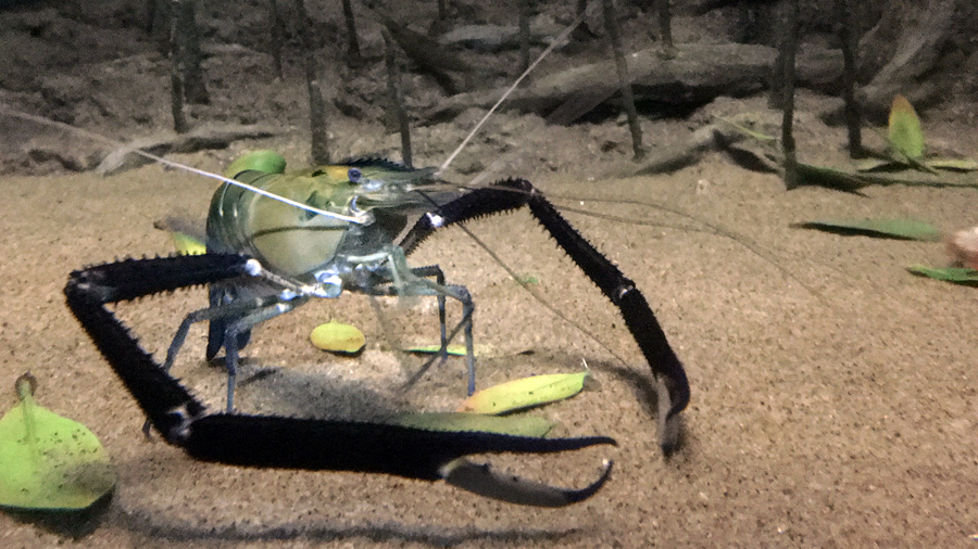 展示水槽にもなれてきた葛西臨海水族園初展示の巨大エビ、オニテナガエビ。その大きさを是非体感しにご来園ください。