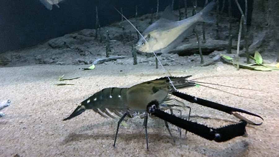 オニテナガエビは東南アジアやオーストラリア北部、パプアニューギニアなどに生息する体長30センチほどにもなる大型のテナガエビのなかまです。テナガエビは一般的にて魚をえさとする傾向が強い生物です。水槽で魚といっしょにするために私たちは展示の際のさまざまな影響を検討したうえで、今年(2017年)の8月、やっと現地から連れ帰ることができたのです。
