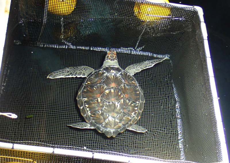 アオウミガメ登場、給餌は「カゴ」の中で