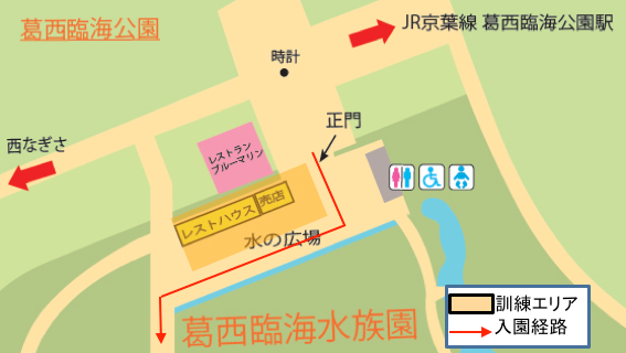 (2)当園正門付近(下図参照)が訓練エリアとなりますので、入園に際し多少のご迷惑をおかけいたしますが、あらかじめご了承ください。