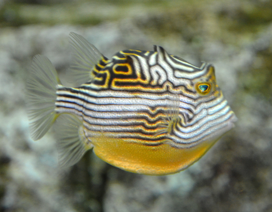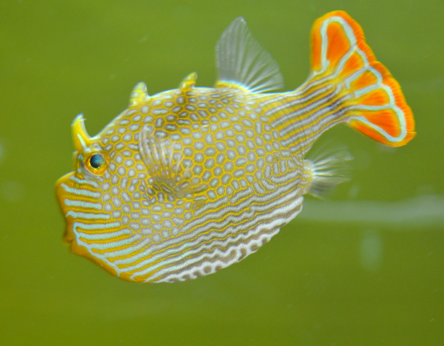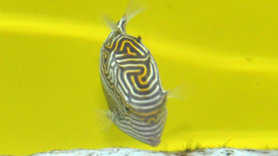 オルネートカウフィッシュはオーストラリア南部からタスマニア島にかけての沿岸に生息するハコフグのなかまです。オルネート(ornate)とは、「飾り立てた、華美な」という意味があります。オルネートカウフィッシュの模様はとても特徴的で、しかもオスとメスでその模様が違い、さらには目の上に角のような突起までついています。まさに飾り立てられたという表現がぴったりです。