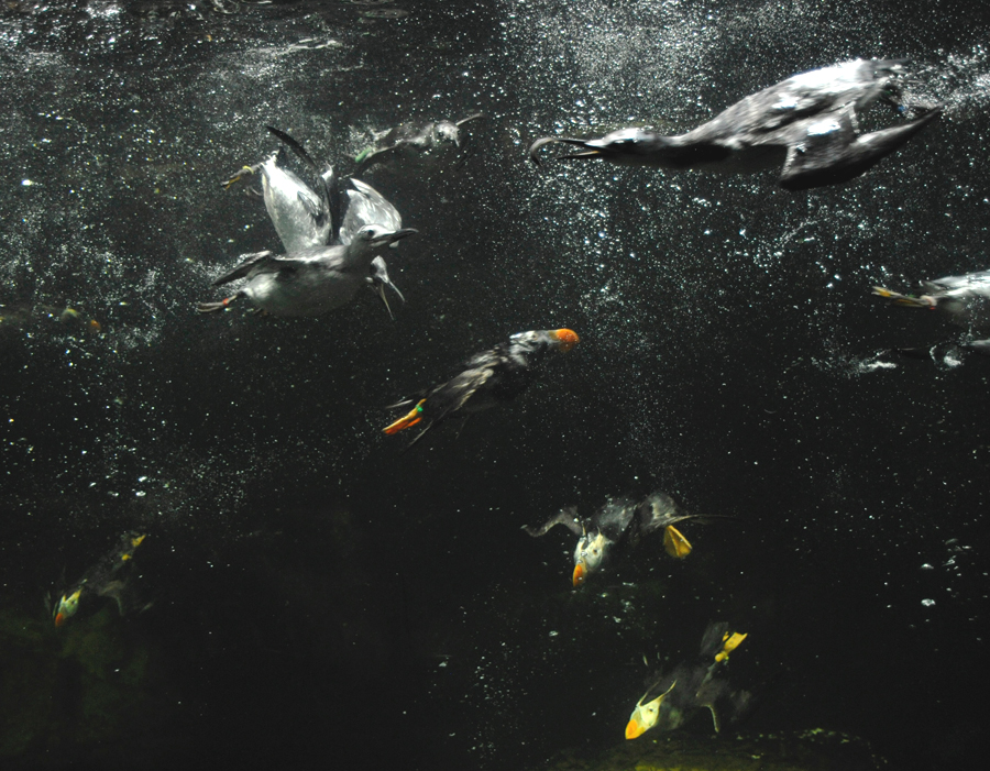「海鳥の生態」エリアのプールは水深約 2.4メートルです。水面近くにいてもあっという間にプールの底に到達するウミガラスとエトピリカを見ると、彼らの潜水能力がわかります。ぜひ、えさの時間にお越しください。