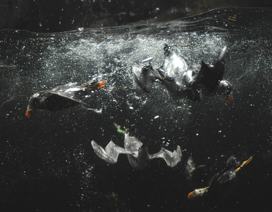 葛西臨海水族園「海鳥の生態」エリアで飼育しているウミガラスとエトピリカの2種は、ペンギンと同じく海にくらす鳥類で、空を飛ぶより水の中に潜るのがとても得意です。水族園では潜水行動をうながすために1日2回、11:45と16:00に水中にえさを投げ入れています。