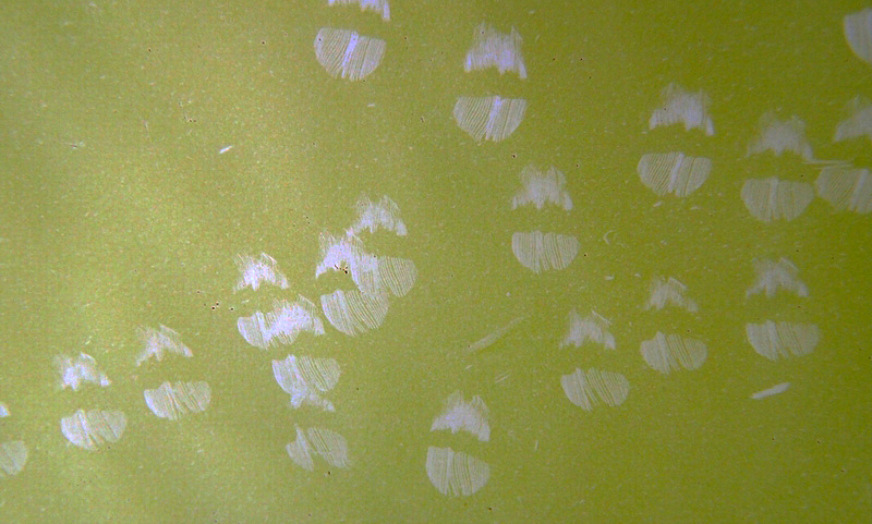ちなみに、この水槽の壁には別のタイプの噛み跡がついている時もあります。こちらは、インドカエルウオがコケを食べる際につけたもので、サザナミハギのものより円形に近い形をしています。