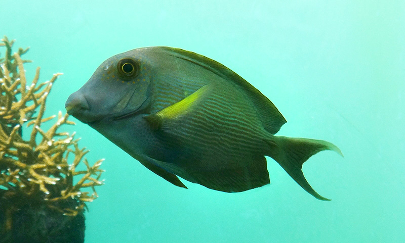 この色っぽいキスマークをつけたのはサザナミハギです。サザナミハギは、太平洋からインド洋にかけて、暖かい海のサンゴ礁域に生息するニザダイ科の魚です。展示しているのは2尾で、全長10センチほどの個体です。色は全体的に黒っぽく、よく見ると体に筋状の縦じま模様があります。頭部から目のまわりにかけてオレンジ色の斑点があるのも特徴です。