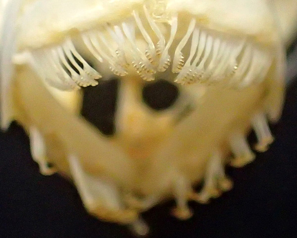 水槽のサザナミハギを見ると、岩や海草に口を頻繁に押しつけるようにして、何かをしきりにかじっています。これは岩などの表面についた藻類や有機物などを食べているのです。じつは、先ほどご紹介したキスマークは、サザナミハギが壁についたコケを食べた跡(歯型)でした。サザナミハギの歯は、先端がブラシ状をしており、コケをはぎ取るのに適した形状をしています。