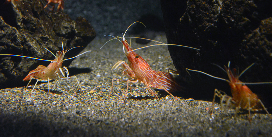 モロトゲアカエビは「世界の海」エリアの「深海II」の水槽に展示しています。このエビは日本海沿岸から北海道、樺太にかけての水深180〜370メートルに生息する深海性のエビです。頭の先にある額角(がっかく)と呼ばれるとげの上下に細かいとげが並んでおり、この特徴から「双方の」という意味を持つ「諸」の字が当てられ、「諸棘赤海老」(もろとげあかえび)と名付けられたといわれています。
