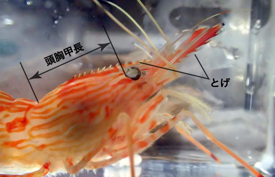 また、このことから性転換する時期はみずからの体長によって決まり、モロトゲアカエビは頭胸甲長(眼の後ろのくぼみから甲の後ろまでの長さ)が2.5〜3.2センチまで成長するとオスからメスに性転換をすると報告されています。