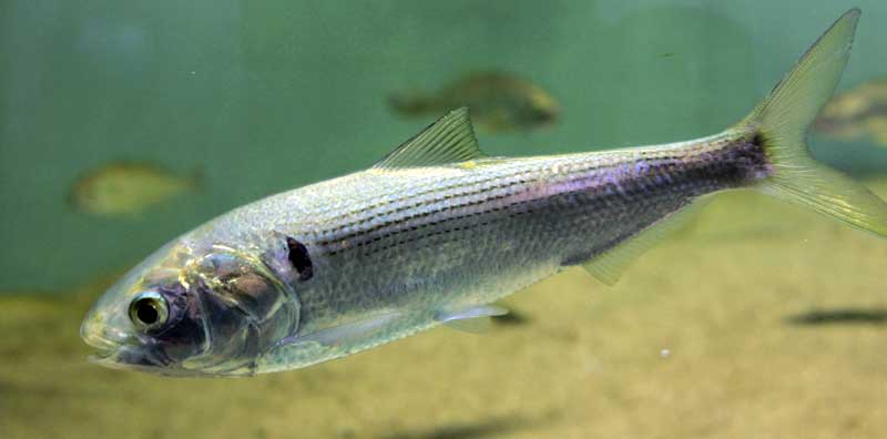成長にともなって呼び名が変わる魚を一般に「出世魚」と呼びますが、今回紹介するコノシロもその一つです。東京ではシンコ(〜全長7センチほど)、コハダ(〜全長15センチほど)、コノシロ(〜全長25センチほど)と変わります。江戸前寿司のネタとして有名なので、一度は食べたことのあるおなじみの魚かもしれません。しかし、生きている姿をお見せするのはそう簡単ではありません。