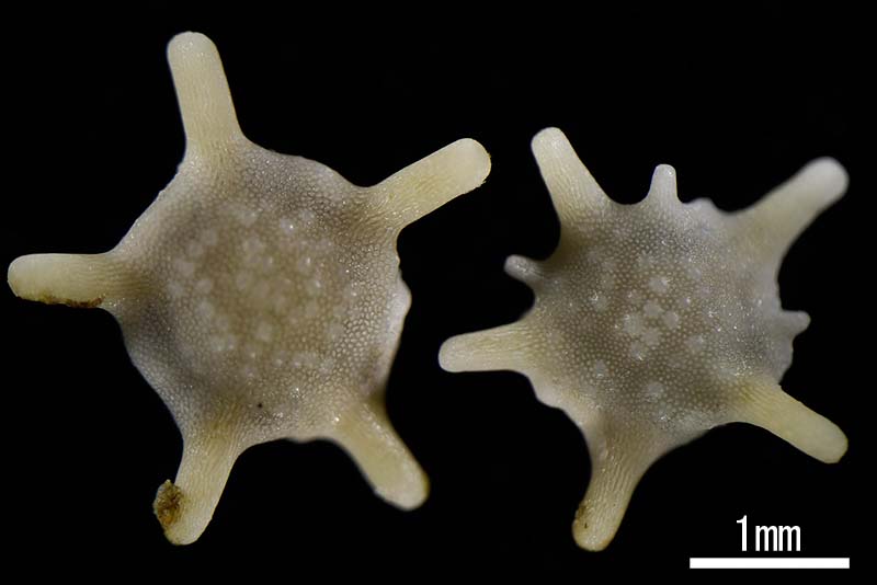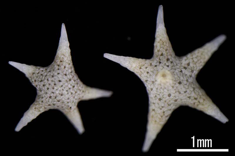 水族園のファンの方ならご存知かもしれませんが、じつはこの星砂、ある生き物の殻なのです。その名もホシズナ。有孔虫と呼ばれる生物の一種で、本体はアメーバのように柔らかいのですが、特徴的な形の石灰質の殻を作って暖かい浅い海にくらしています。星型のとげの先端には穴が開いていて、そこから偽足と呼ばれる糸のような器官を出してえさを捕ったり、海藻などへに付着したり、移動に使ったりしています。