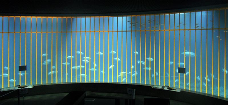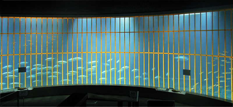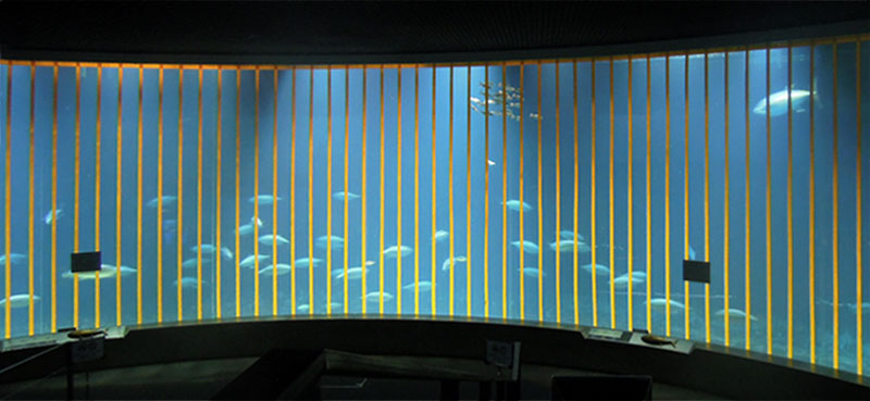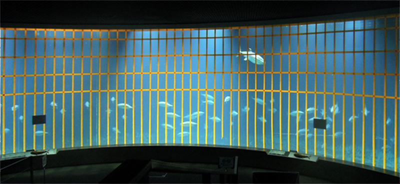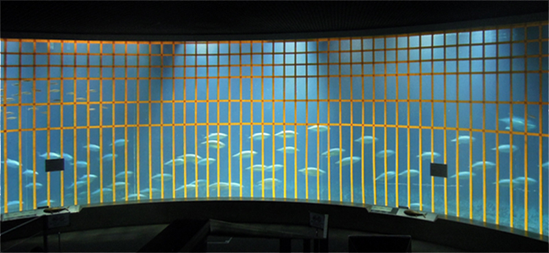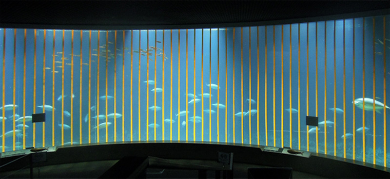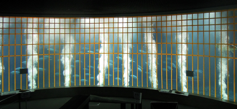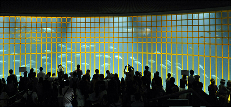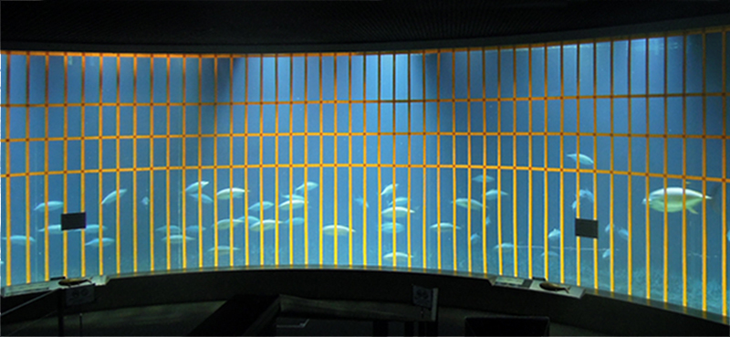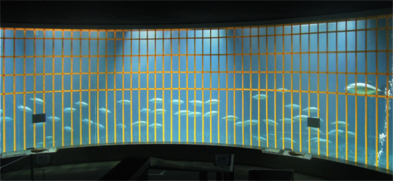| 2015年7月2日(木) 本日から休園日を除く毎日、この「今日のマグロたち」のページで葛西臨海水族園のクロマグロたちのようすをお伝えします。2015年6月21日の搬入後、多くのクロマグロがえさを食べるようになってきました。昨日7月1日、水槽のアクリルガラス面に貼った衝突防止テープのうち、横方向の1本を剥がしました。見た目は余り変わりませんが、どの部分かおわかりになりますか? |