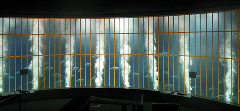 | 2015年7月10日(金) 水槽内のタカサゴの数が減ってきているのにお気づきの方がいらっしゃるかもしれません。じつは日々、職員がタカサゴを別の水槽へと少しずつ移しているのです(クロマグロが肉食性とはいえ、マグロたちに食べられているわけではありません)。金曜日の本日午前中はダイバーによる定例の水槽掃除。マグロたちが驚いてアクリル面に衝突しないよう、午前中は水槽中に気泡を立ち上らせています。 |